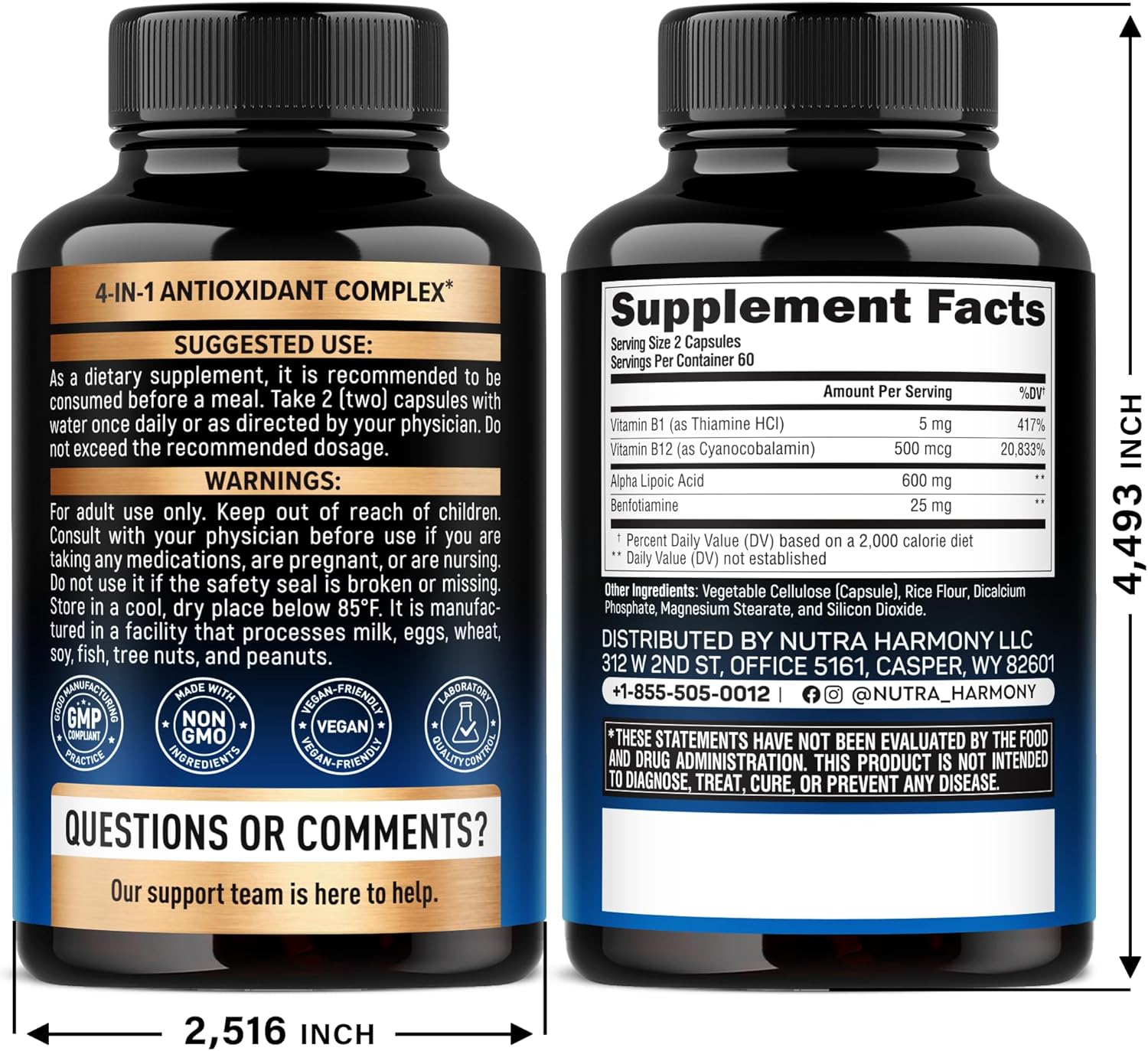 4-in-1 Potent Blend — with Benfotiamine, Vitamins B1 & B12. Our ALA supplement combines Alpha Lipoic Acid with Benfotiamine and vitamins B1 & B12, creating a complex support system for nerve health support and energy metabolism. This alpha lipoic acid blend is ideal for those seeking nerve health supplements and comprehensive antioxidant aid.