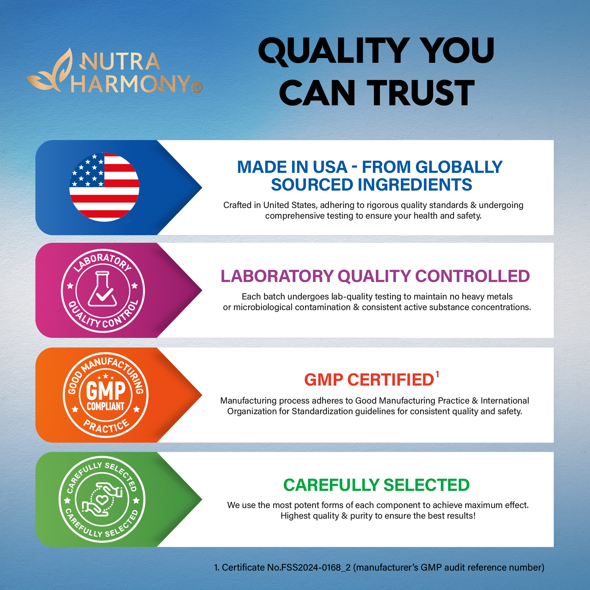 Made in USA With Globally Sourced Ingredients — ALA supplement is proudly manufactured in the USA under strict quality control standards, Third Party Tested & GMP certified. We adhere to rigorous procedures to ensure every batch's safety, purity, and efficacy. We use the most potent forms of each component to achieve maximum effect. Highest quality & purity to ensure the best results!