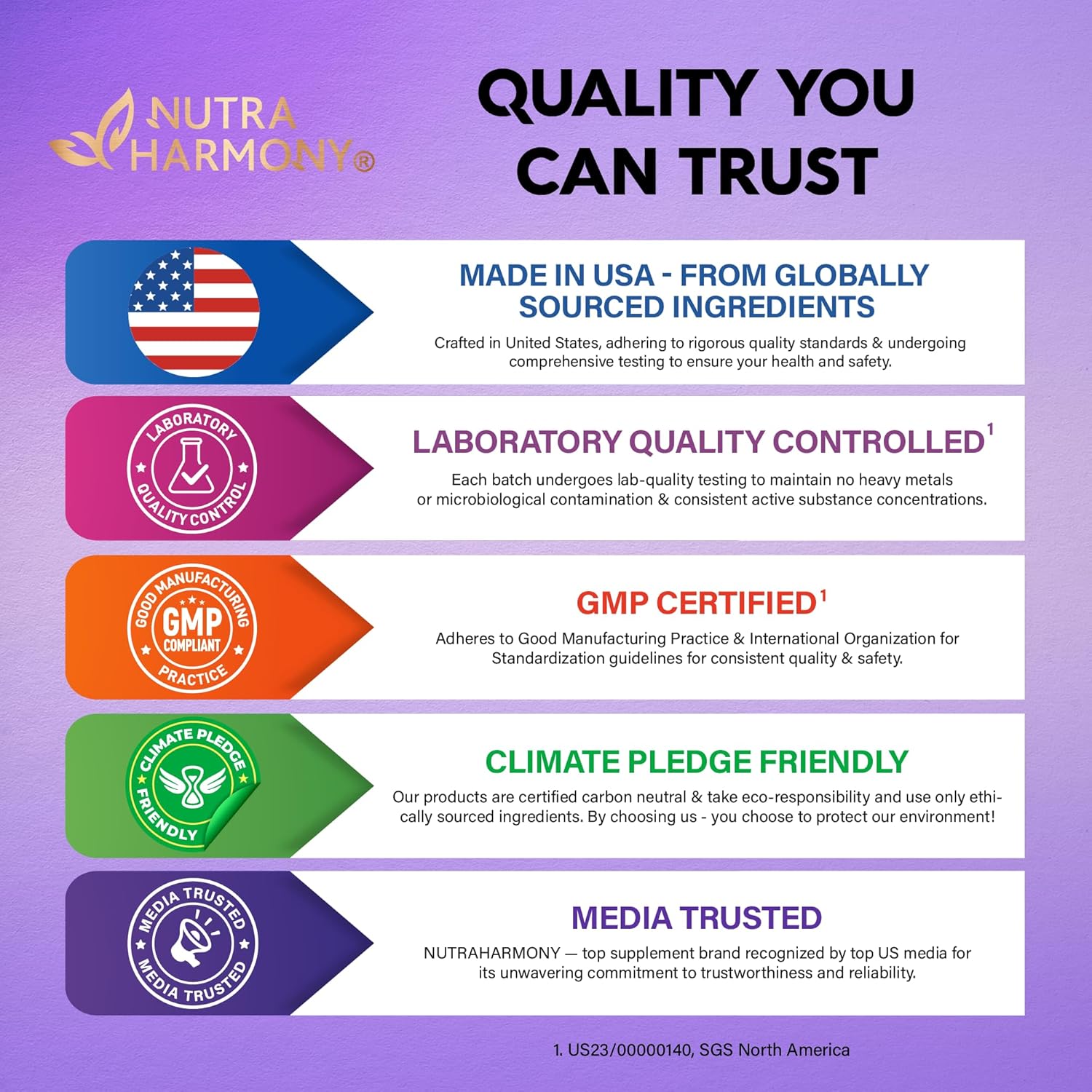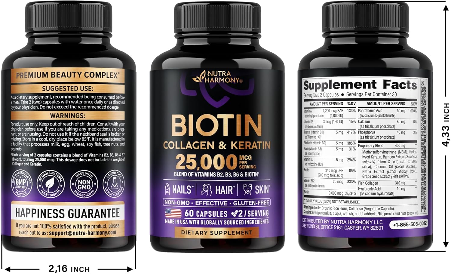 - Biotin with Hyaluronic Acid & Collagen Supplement — The Nutraharmony biotin supplement contains potent Biotin, Collagen, Keratin, and other essential nutrients that naturally support your health and beauty. Take two capsules a day with our highly bioavailable formula that promotes fast and proper absorption. Take care of your skin.