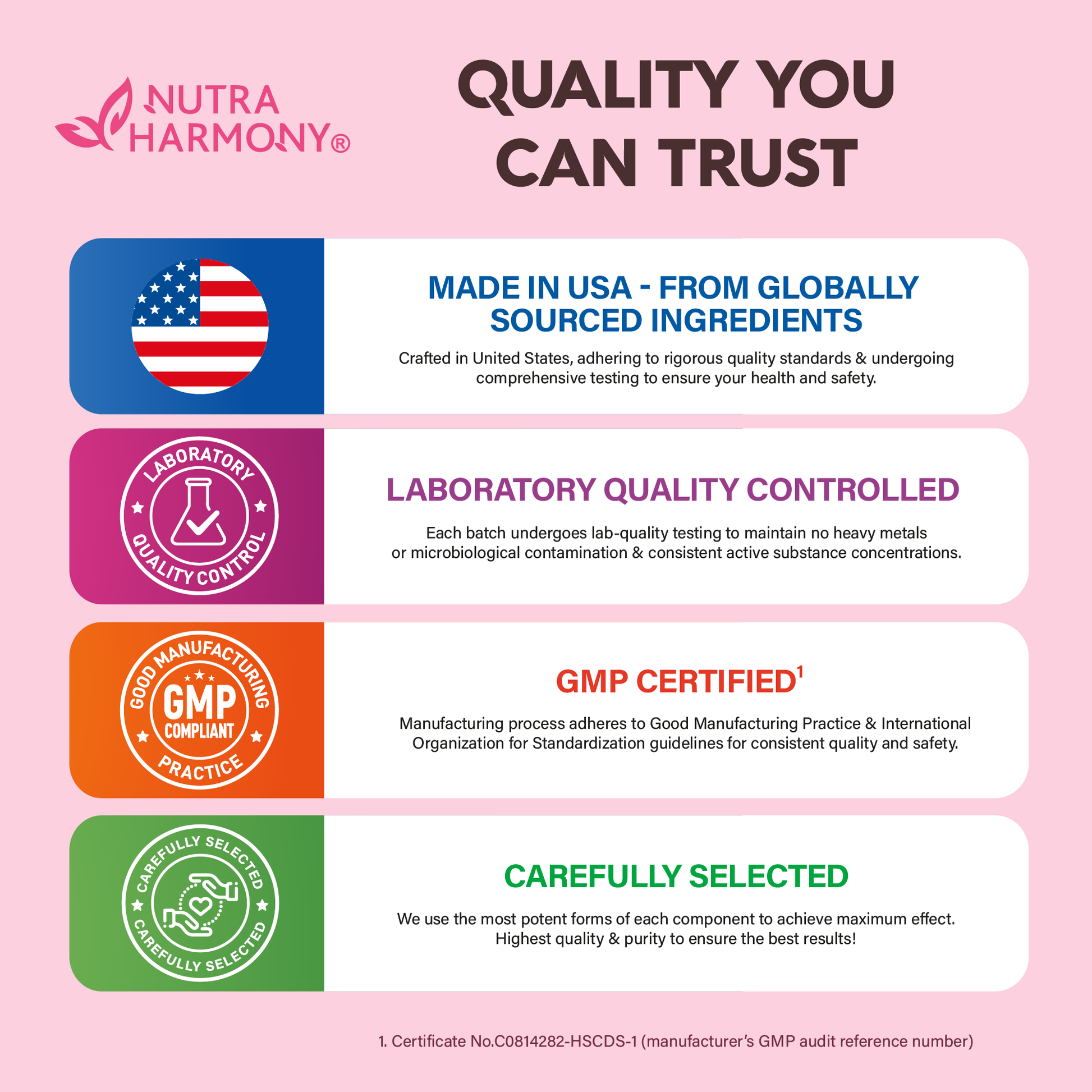 TRUSTWORTHY SERVICE — at NUTRAHARMONY, your health is our priority. From premium ingredient sourcing to precision manufacturing, we provide reliable supplements supported by customer-focused care.