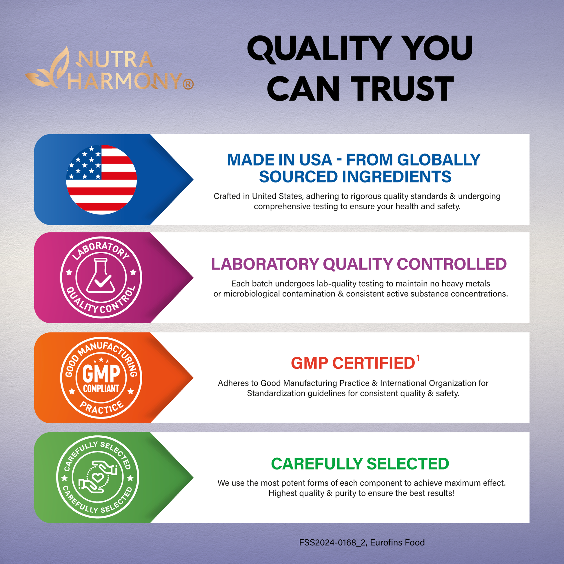 Made in the USA — L theanine from NUTRAHARMONY does not contain GMOs; it's dairy-free, gluten-free, nut-free, wheat-free, soy-free, nightshade-free, and sugar-free. L-theanine is a perfect addition to your gluten-free & vegan lifestyle with advanced support and significant effects