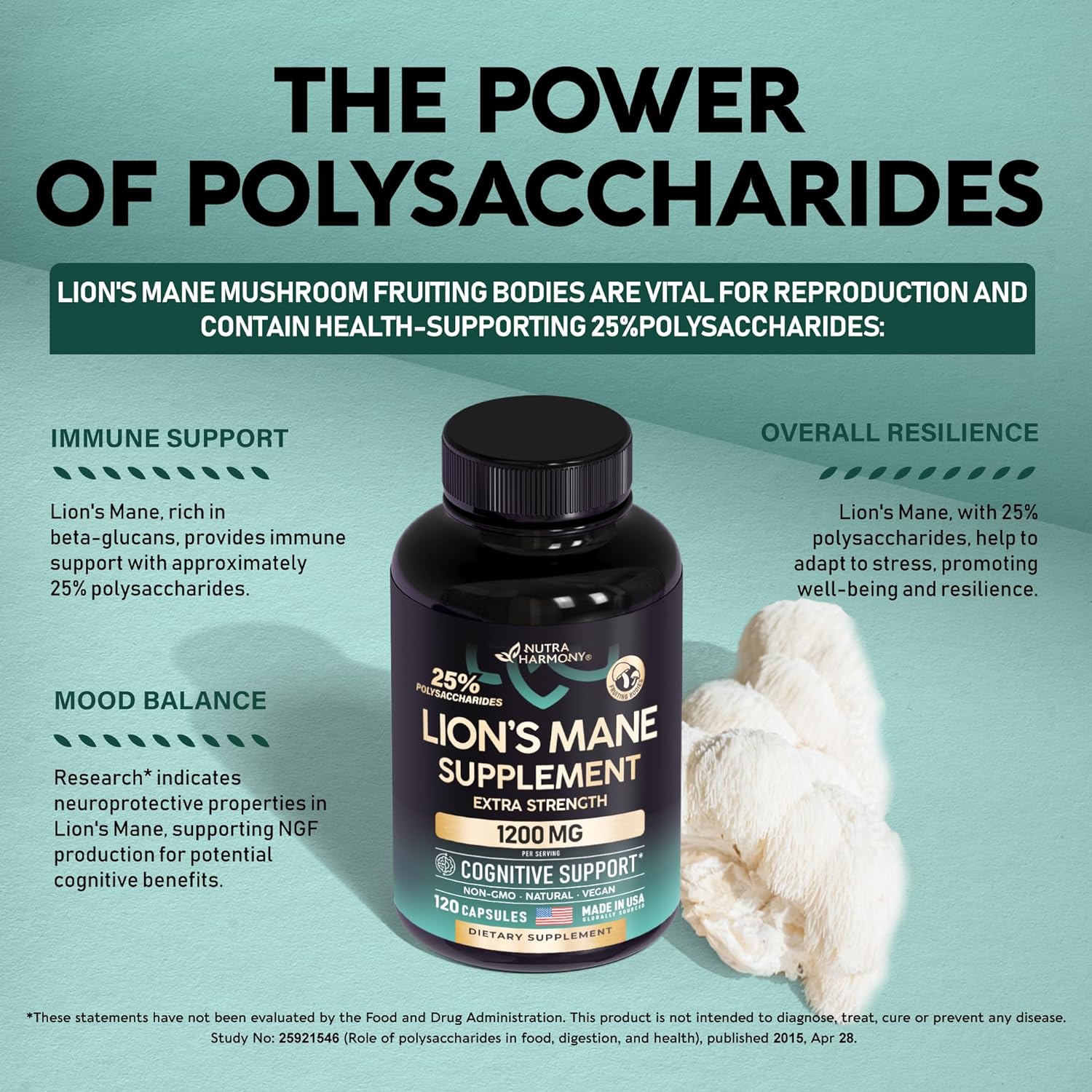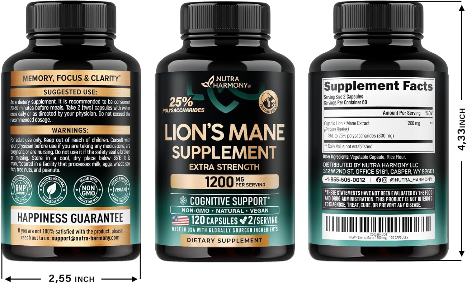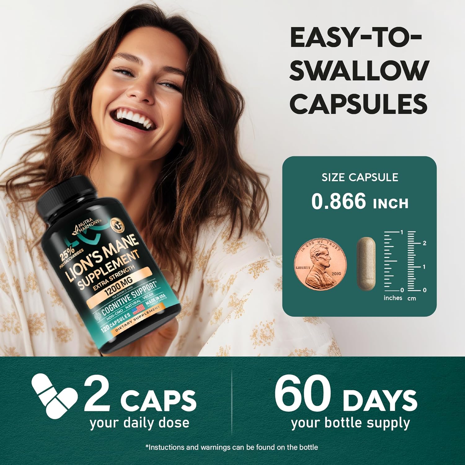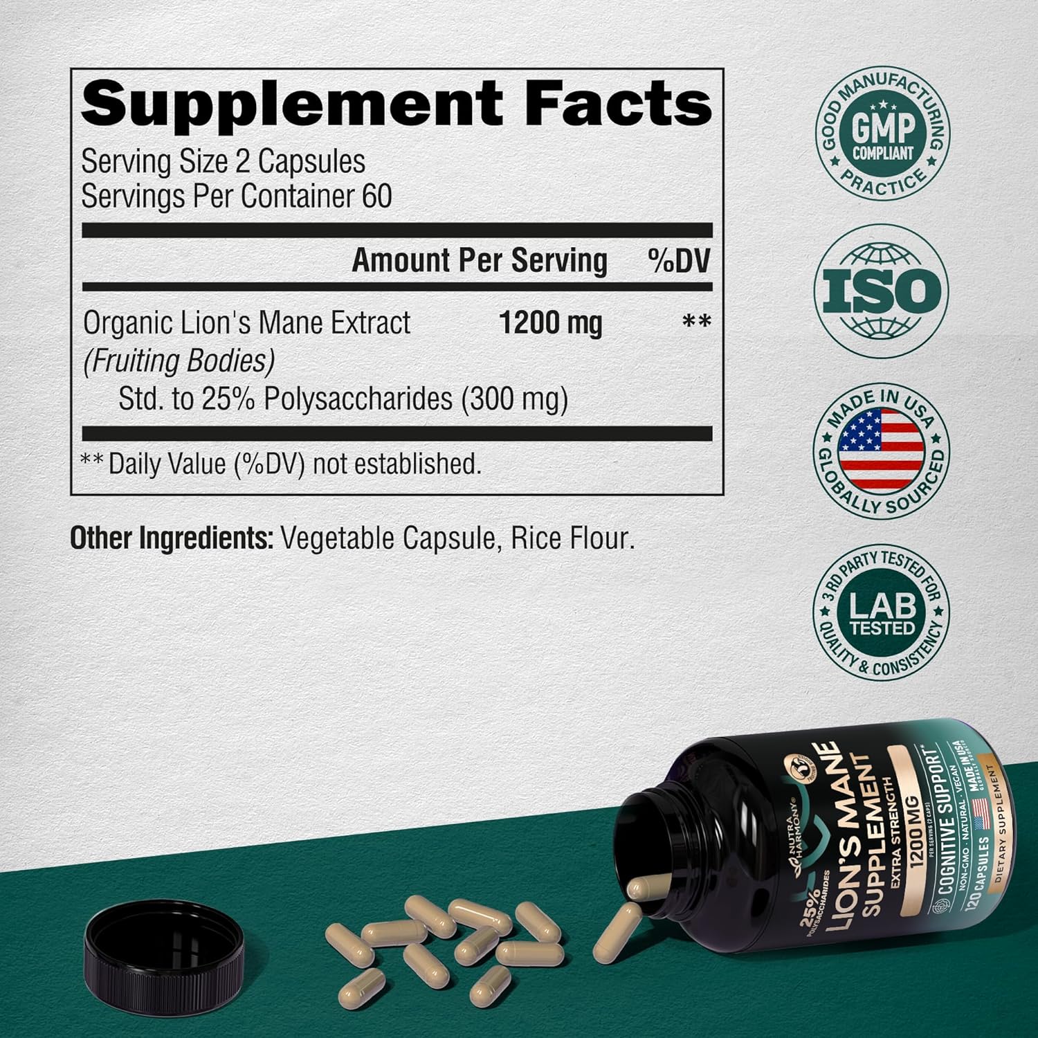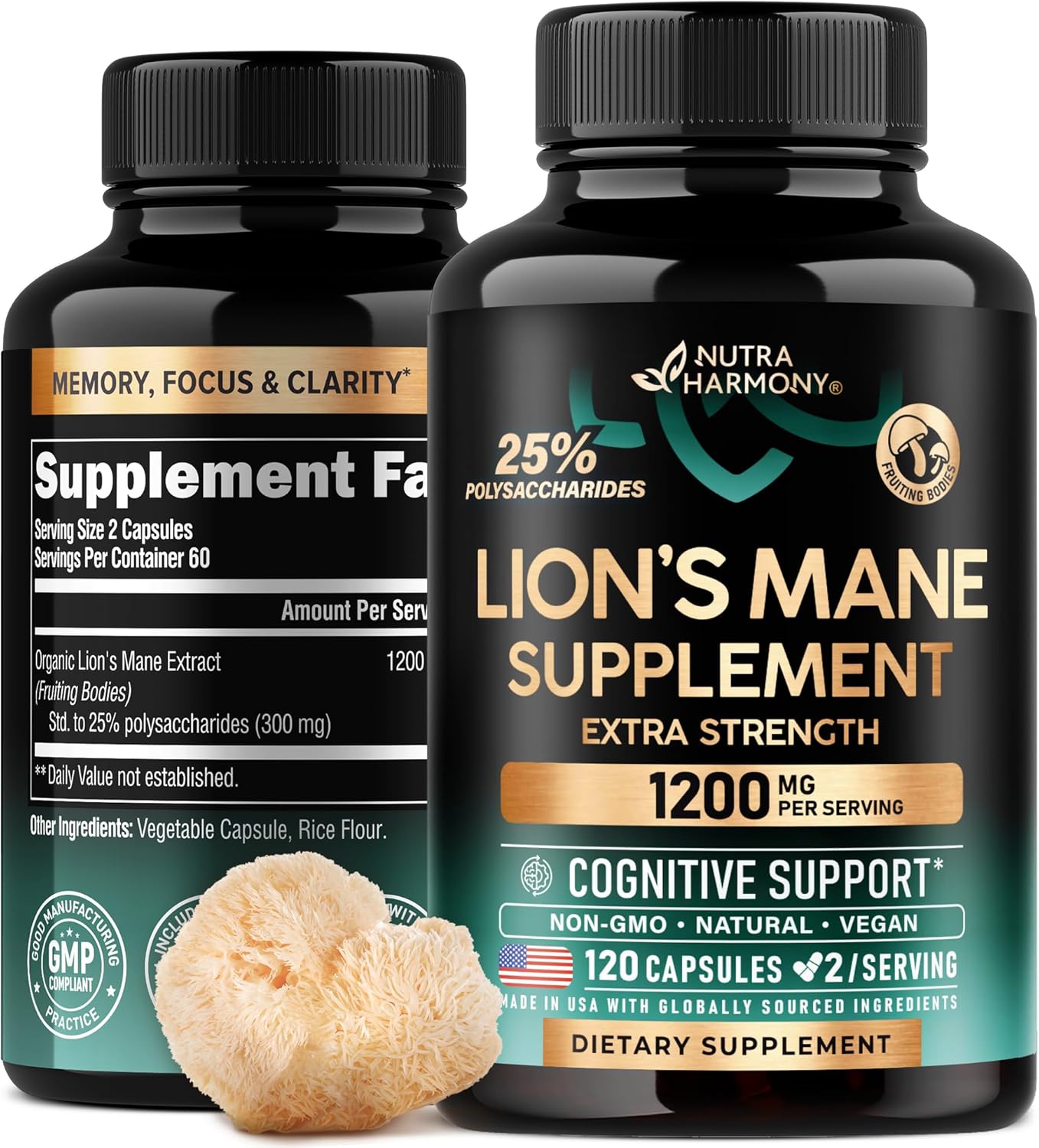 - Lions Mane Mushroom – Each capsule delivers a potent 1200mg dose of lions mane extract, a perfect blend of nature's wisdom and scientific precision. Elevate your brainpower naturally with a powerful mushroom boost to support cognitive health, memory, focus, mental clarity, and overall well-being.