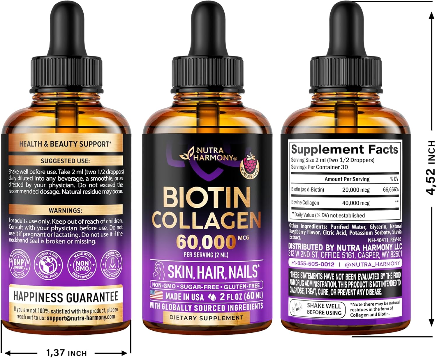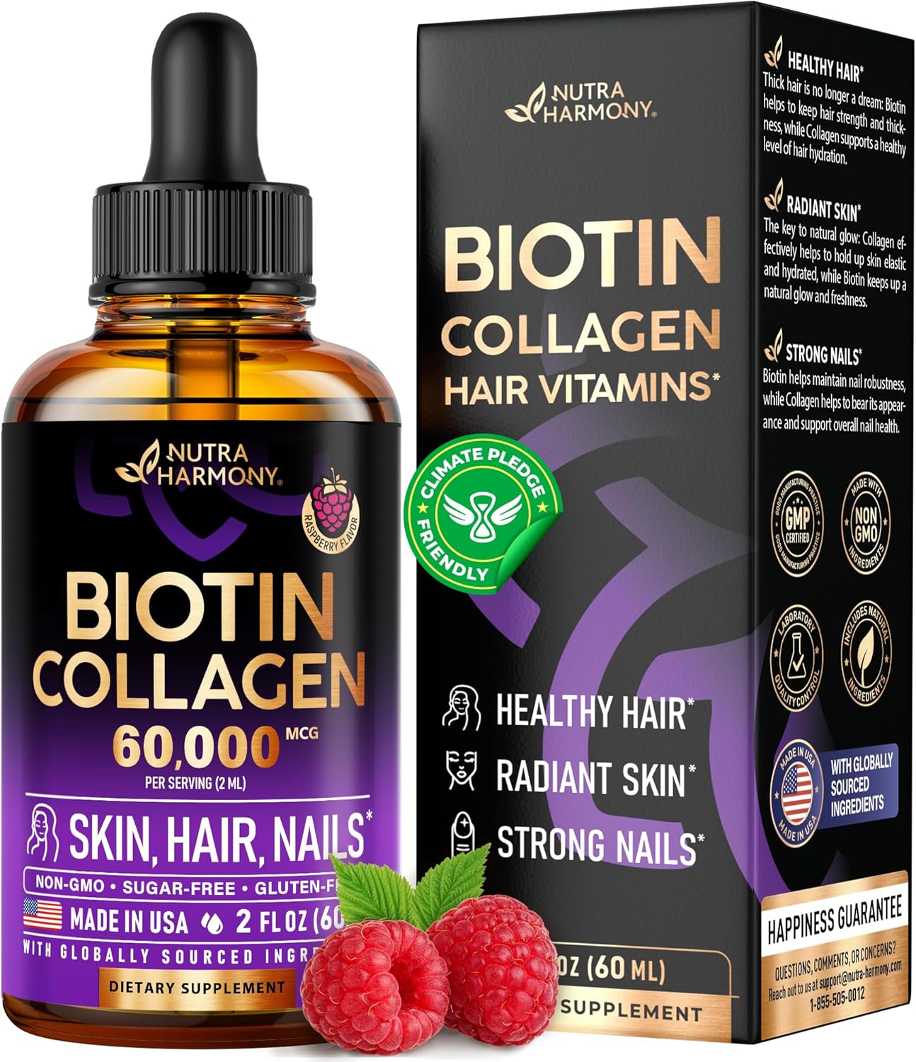 - Radiant Hair with Biotin Elixir — liquid Biotin supplement is expertly crafted to elevate hair's vitality. It nurtures hair from within, enhancing its overall appearance and imbuing each strand with lustrous, vibrant health. A fusion of biotin and collagen works in synergy, ensuring your hair shines with timeless beauty.
