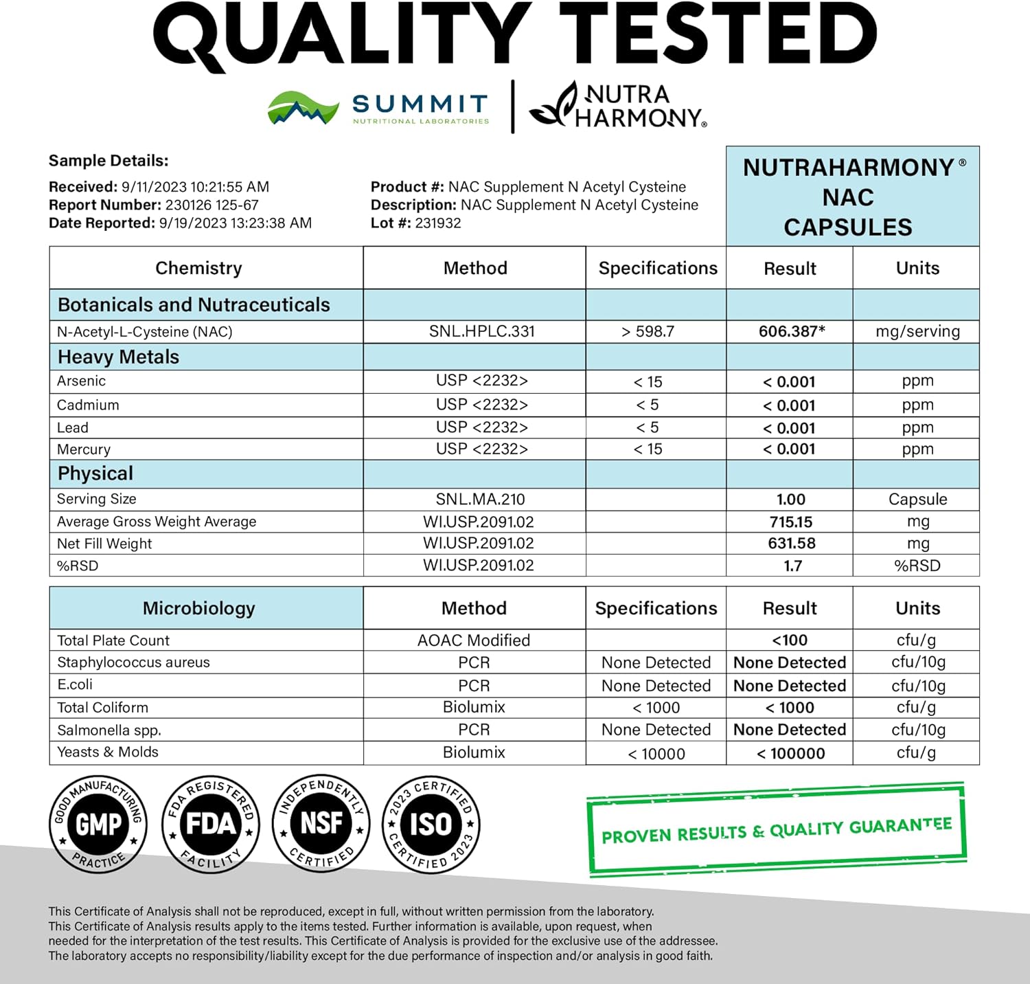 - High-potency & High-quality — Non-GMO, soy-free, gluten-free & vegan N-acetylcysteine supplement! Manufactured in the USA using advanced technology to ensure the finest quality! That's why N-acetyl-l-cysteine capsules are safe, effective & perfect for everyday use. Third Party Testing — The results of third party testing are shown in the images of our product.