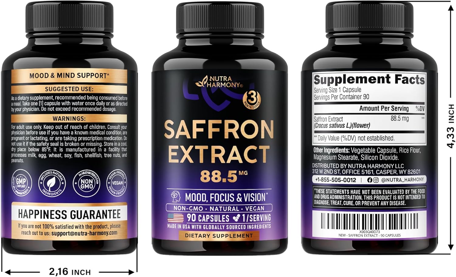 - ๐ธ ๐๐๐-๐ฆ๐๐๐ โ Saffron from NUTRAHARMONY does not contain GMOs; it's dairy-free, gluten-free, nut-free, wheat-free, soy-free, nightshade-free, and sugar-free. Also, itโs a perfect addition to your gluten-free & vegan lifestyle with mood & mind support and significant effects.