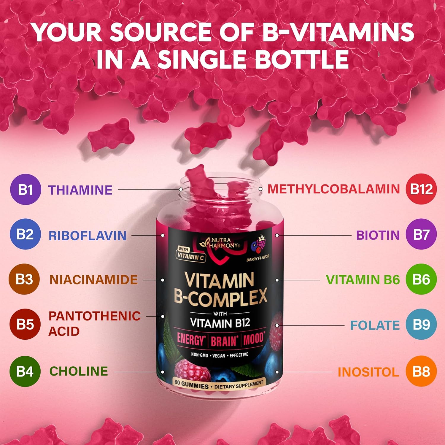 - Vitamins B1, B2, B3, B5, B6, B7, B12 & C — each gummy delivers powerful support with Vitamin B1 Thiamine, B2 Riboflavin, B3 Niacin, B5 Pantothenic Acid, B6 Pyridoxine, B7 Biotin, B12 Methylcobalamin, with Vitamin C, Inositol & Choline — offering comprehensive and delicious support for your daily wellness. Perfect for those looking for a high-quality vitamin B complex for women and men!
