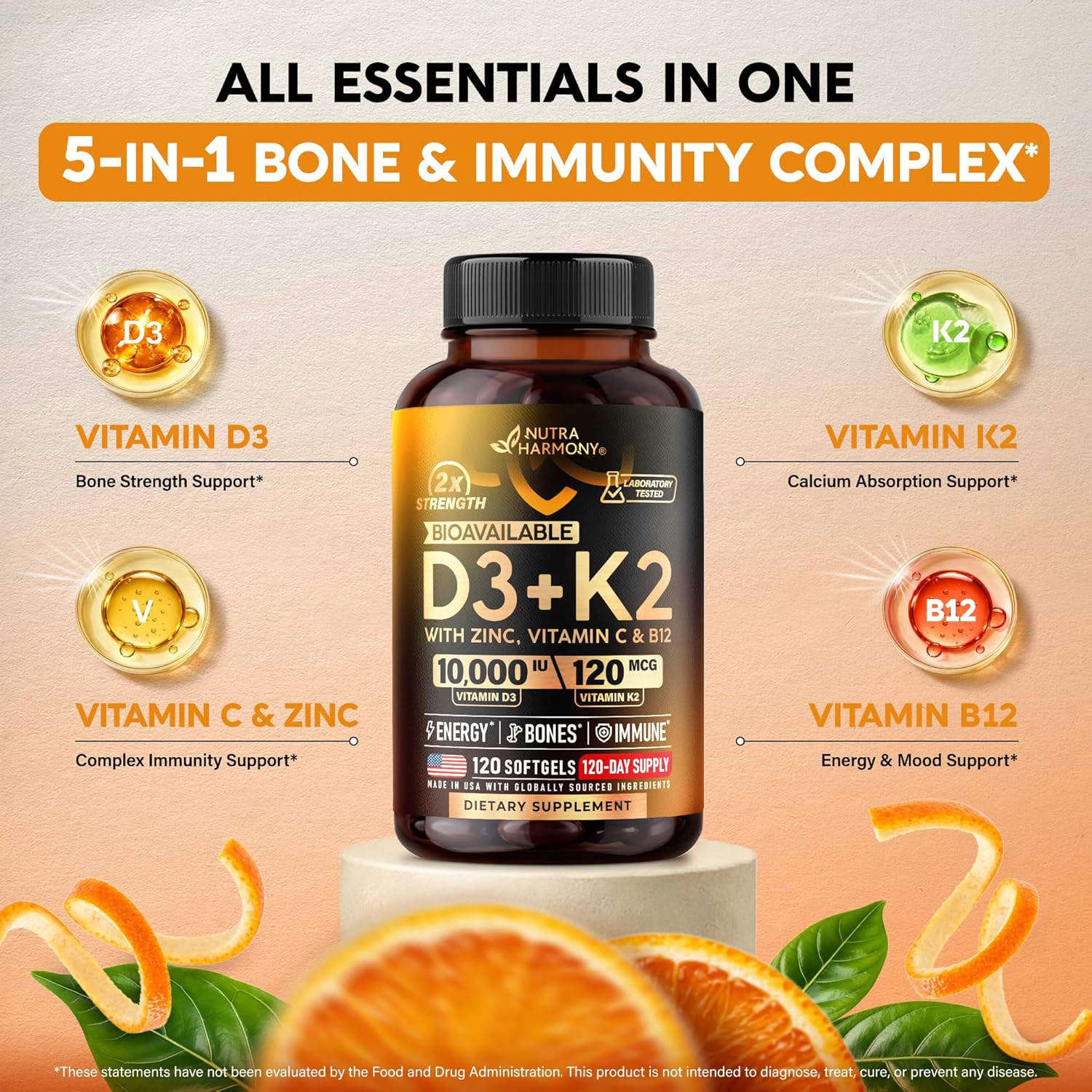 BONE STRENGTH, DENSITY & CALCIUM ABSORPTION – Vitamin D3 helps the body absorb Calcium efficiently, while Vitamin K2 supports proper Calcium absorption in bones & teeth. Together, they support bone strength, bone density, and long-term skeletal health.